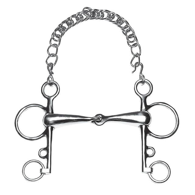 Pelham : effet de levier assez fort pour solliciter un « placer » d’autorité et une prise importante sur la mise en avant. Il faut donc l’utiliser sur des chevaux avec de l’impulsion. Effet plus ou moins fort selon la longueur des branches et le réglage de la gourmette. Employé soit en rêne directe (assez rare), soit à 4 rênes avec la dextérité nécessaire, soit avec une alliance permettant d’obtenir un effet intermédiaire et atténue la sévérité de cette embouchure.