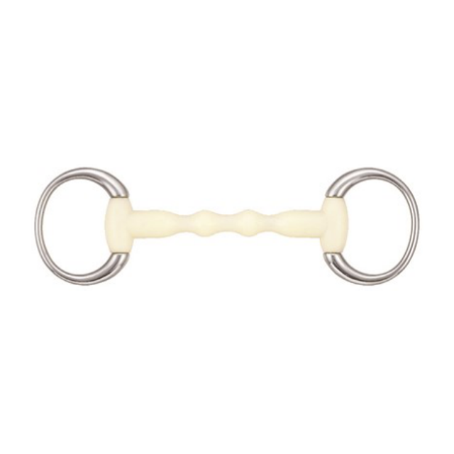 Conçu en acier inoxydable et résine parfumée à la pomme. Résine composée de polyuréthane non toxique, qui offre au cheval un goût prolongé de pomme afin d’aider à l’acceptation du mors. Les mors en résine restent à température ambiante. Ils offrent un contact doux mais moins tendre et épais qu’un mors en caoutchouc. Le goût pomme encourage la mastication.