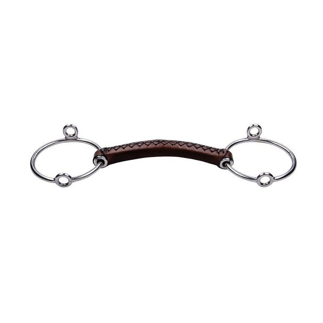 Mors en nylon renforcé, recouvert par un cuir naturel cousu. Le mors devient plus confortable lorsque le cheval salive. Idéal pour les chevaux à bouche sensible.